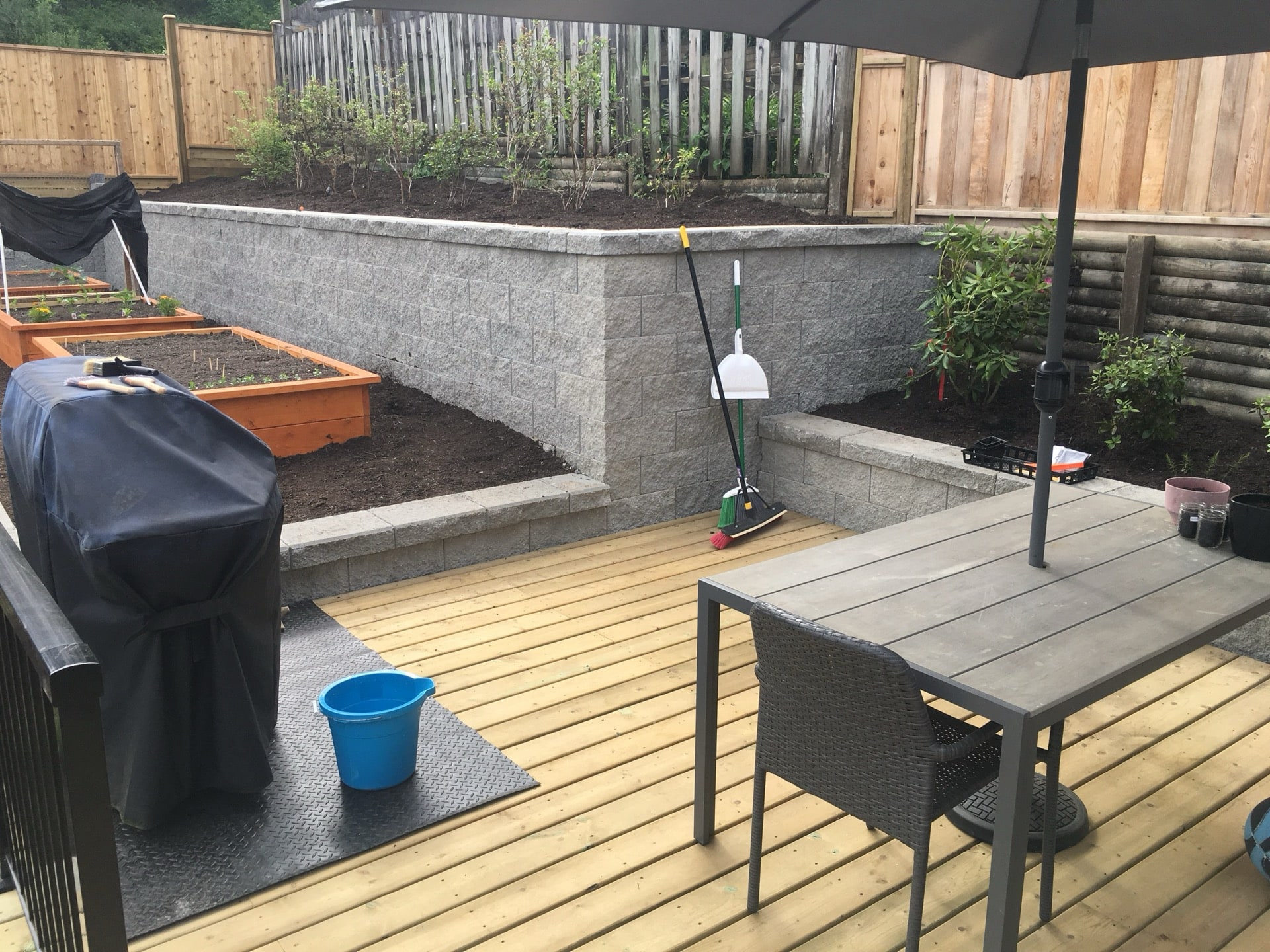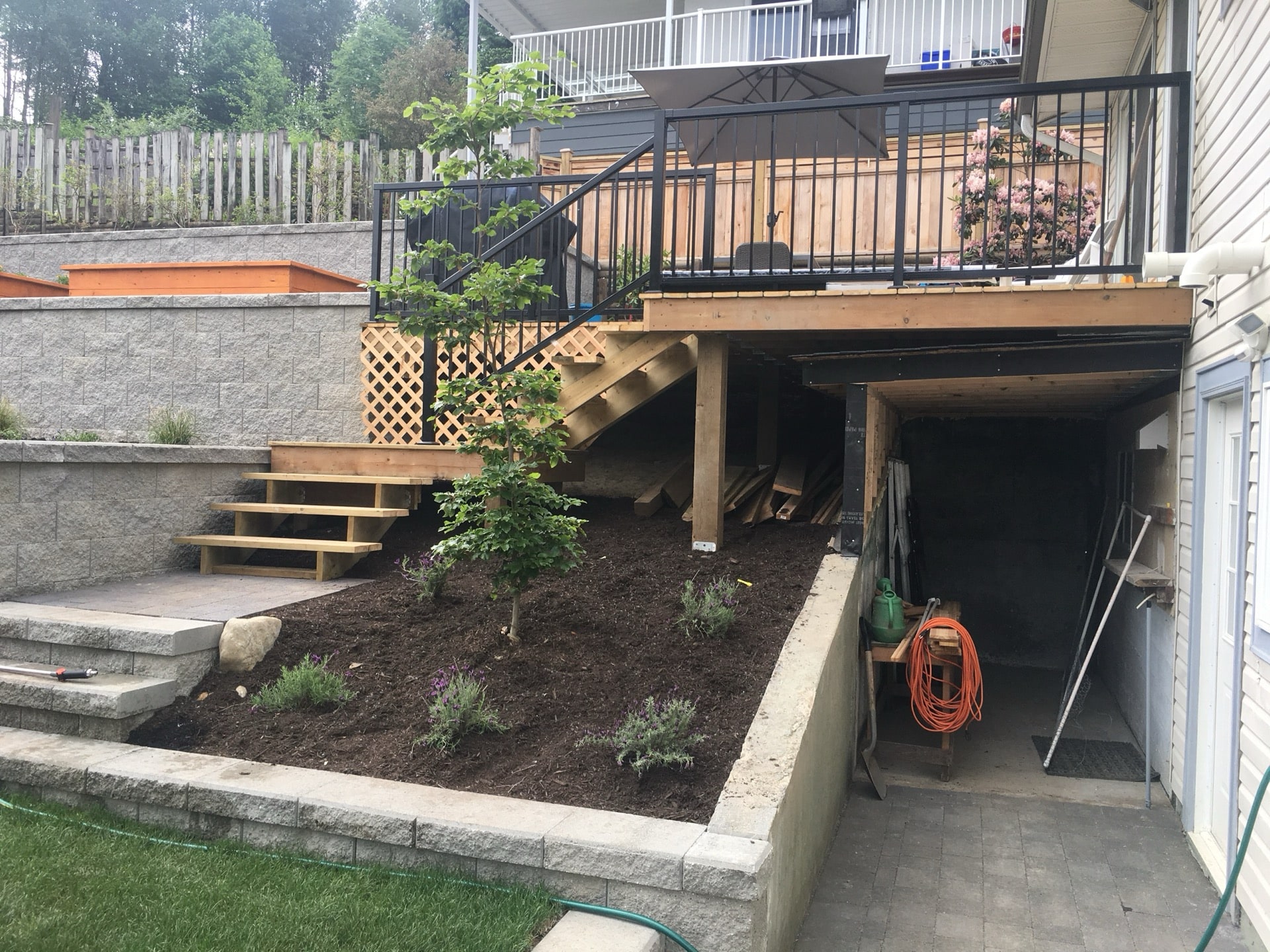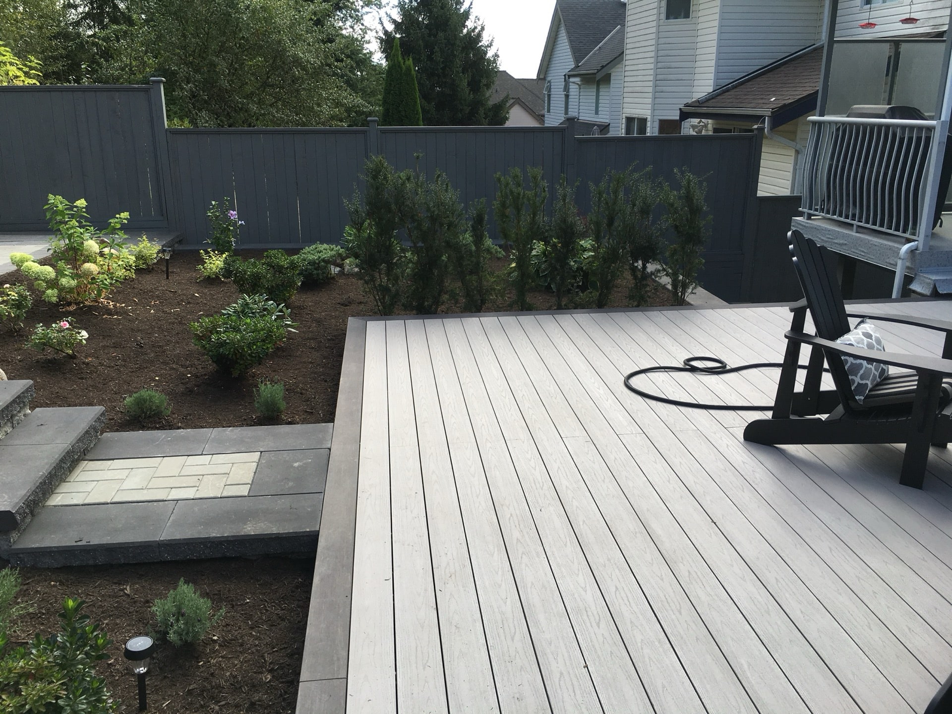 A lovely semi retired couple hired us to completely renovate the back and side yards of their home in Pitt Meadows. They had an old rotten deck and landscape tie retaining walls. Together we came up with a design involving a paving stone patio that is much more durable than wood decking.