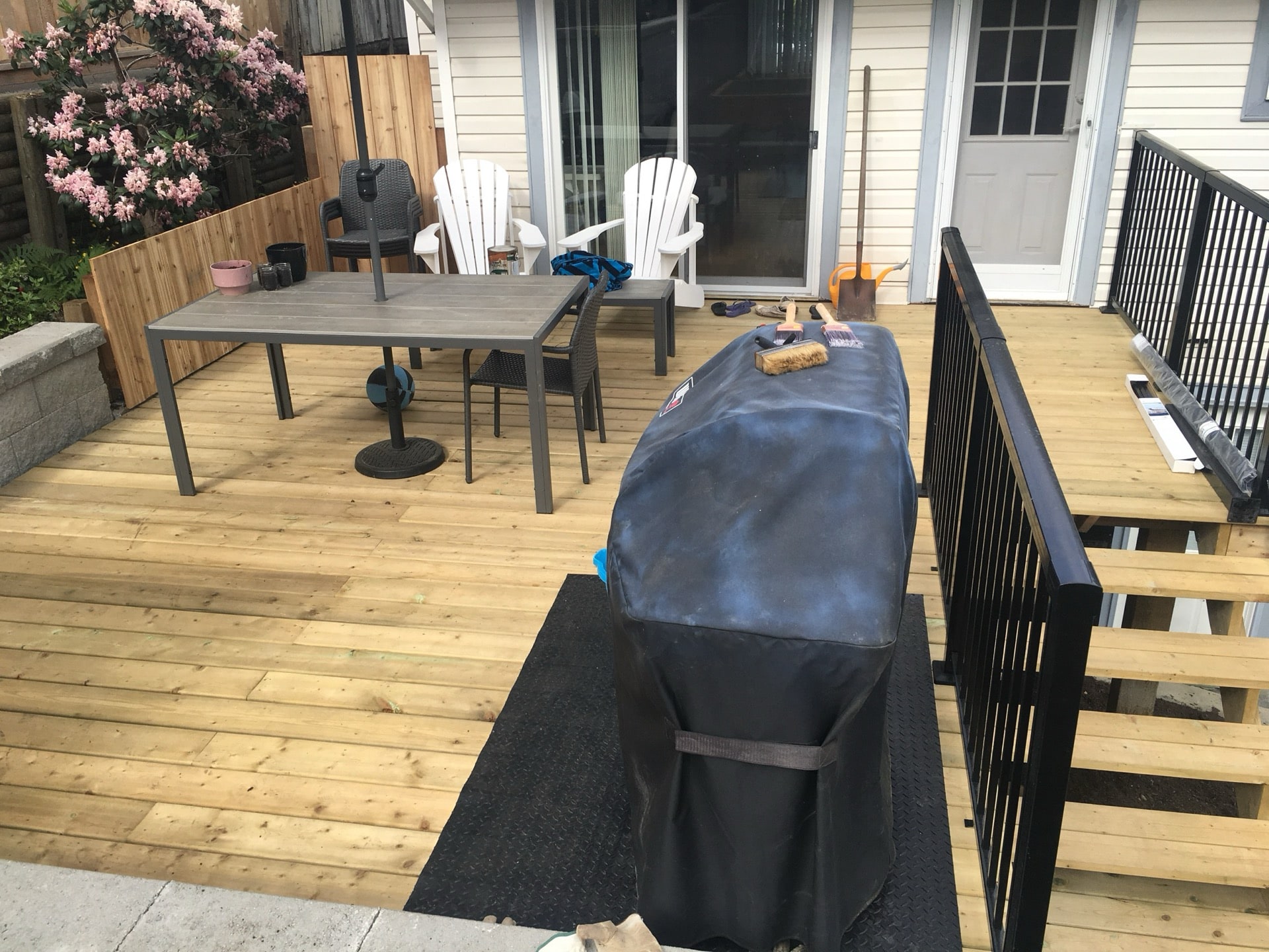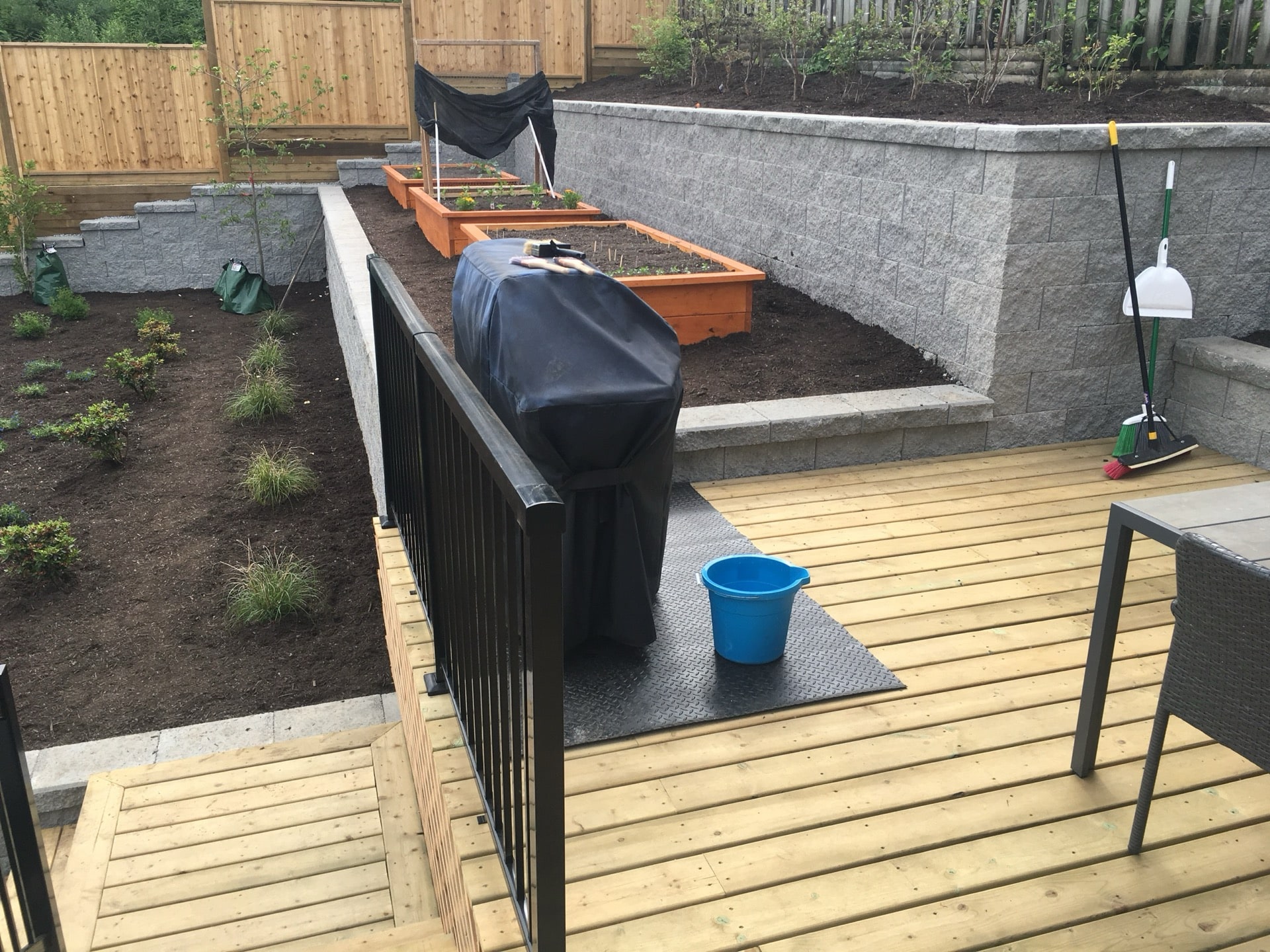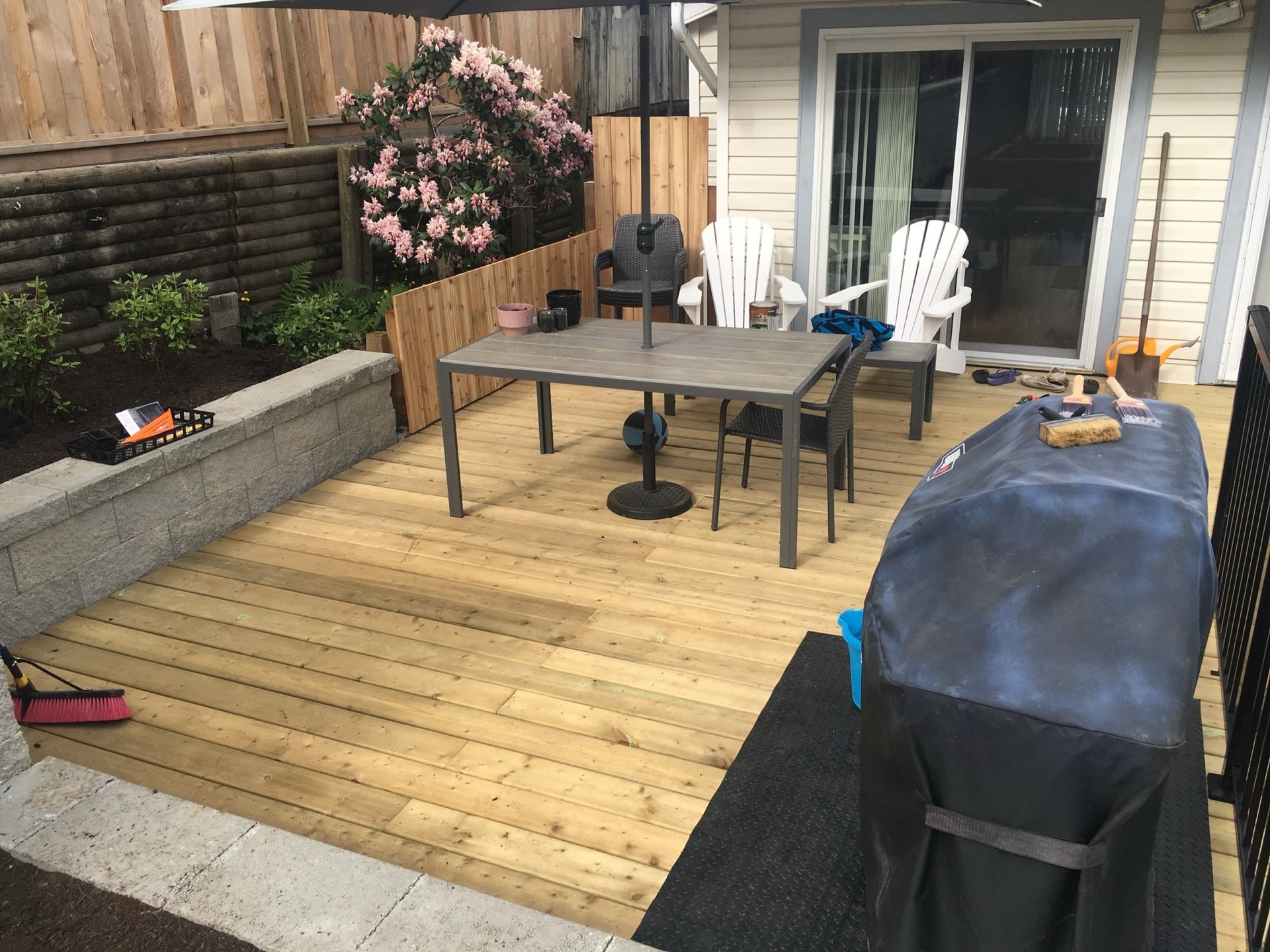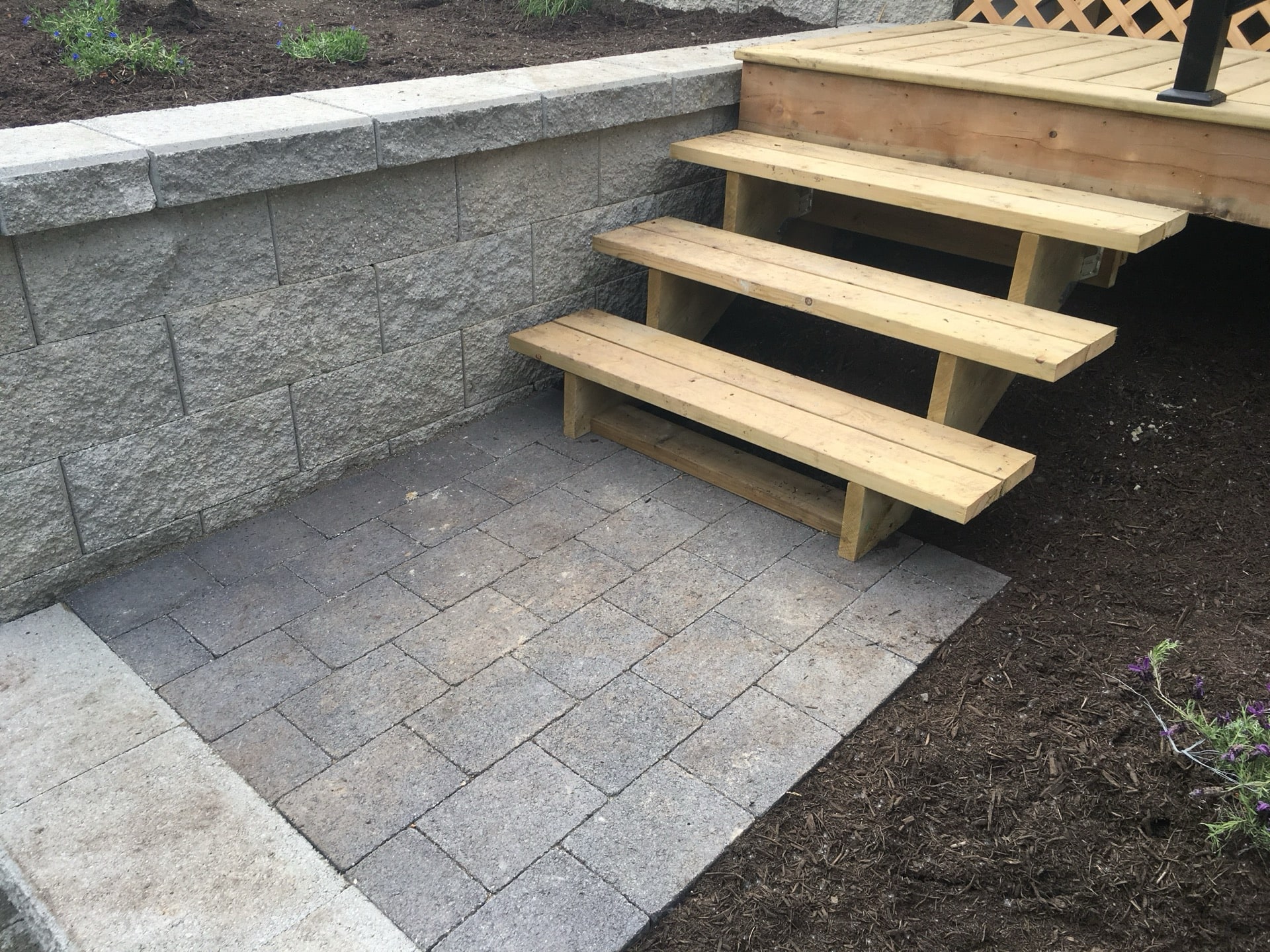 A lovely semi retired couple hired us to completely renovate the back and side yards of their home in Pitt Meadows. They had an old rotten deck and landscape tie retaining walls. Together we came up with a design involving a paving stone patio that is much more durable than wood decking.