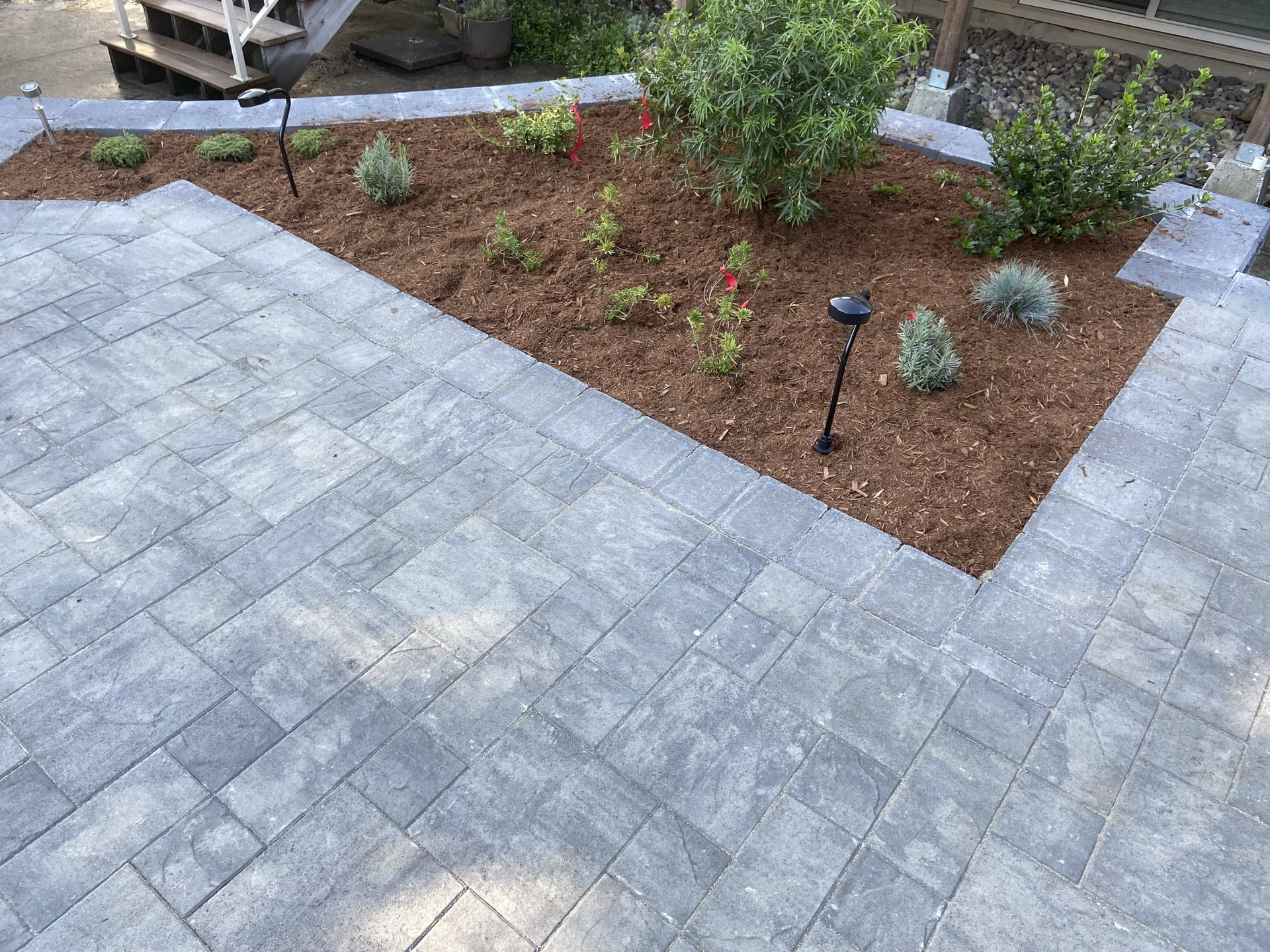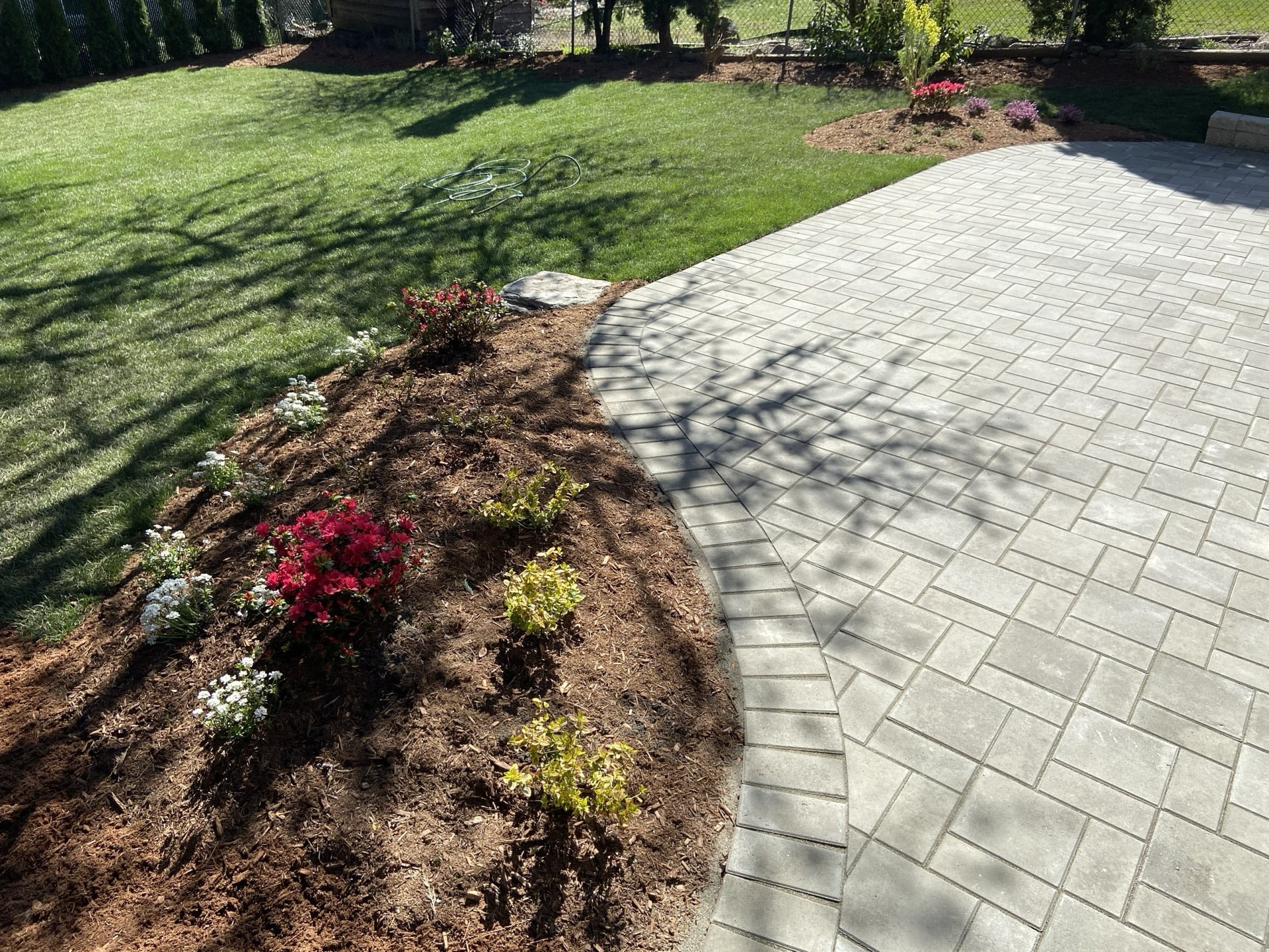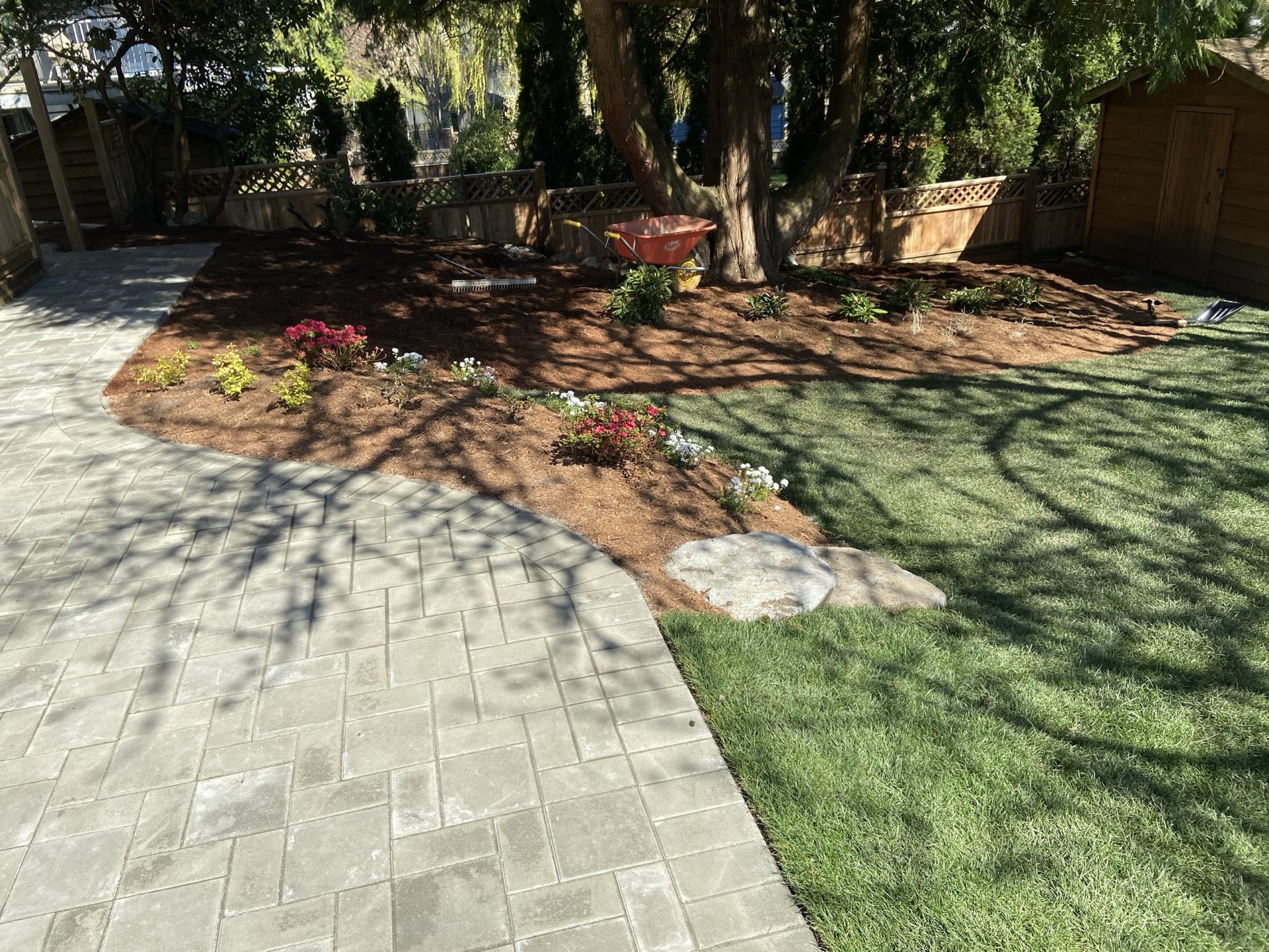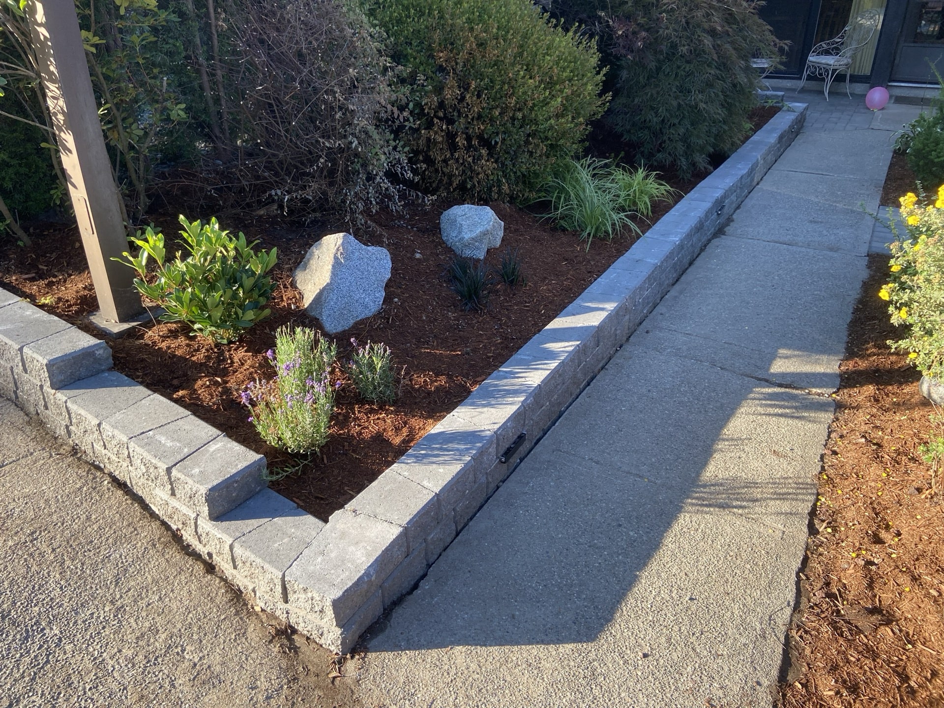 A wonderful couple moved into a older home in Anmore that needed a landscape renovation. This project started with a design done by us Nicholson Landscaping. The wife is very knowledgeable with plants and gardening and immediately loved our design, which included many flowering plants in a rock area with a stepping stone pathway.