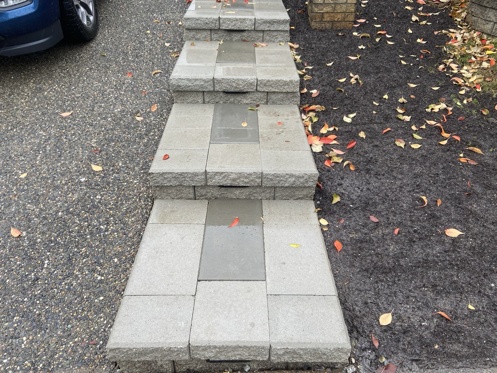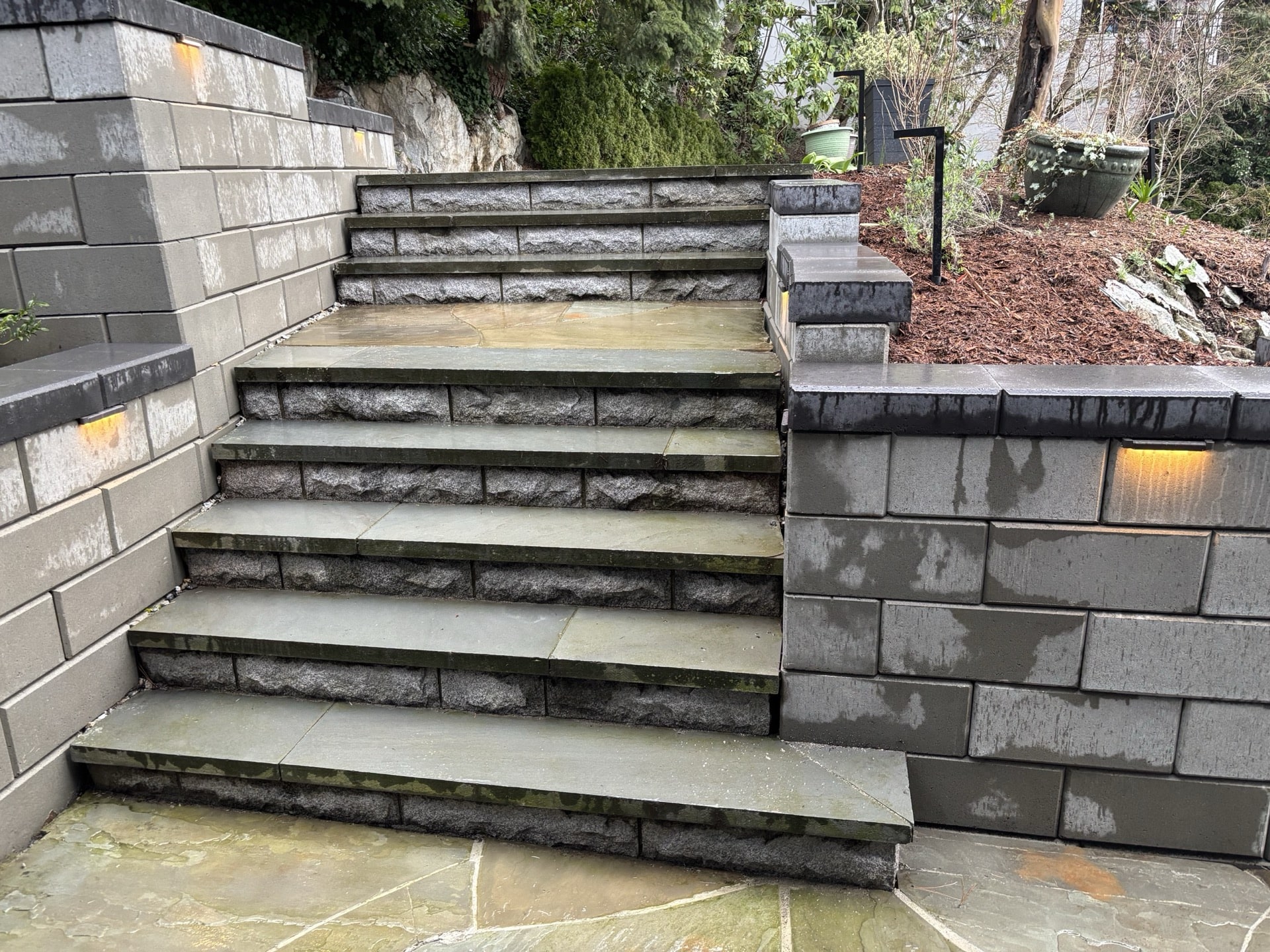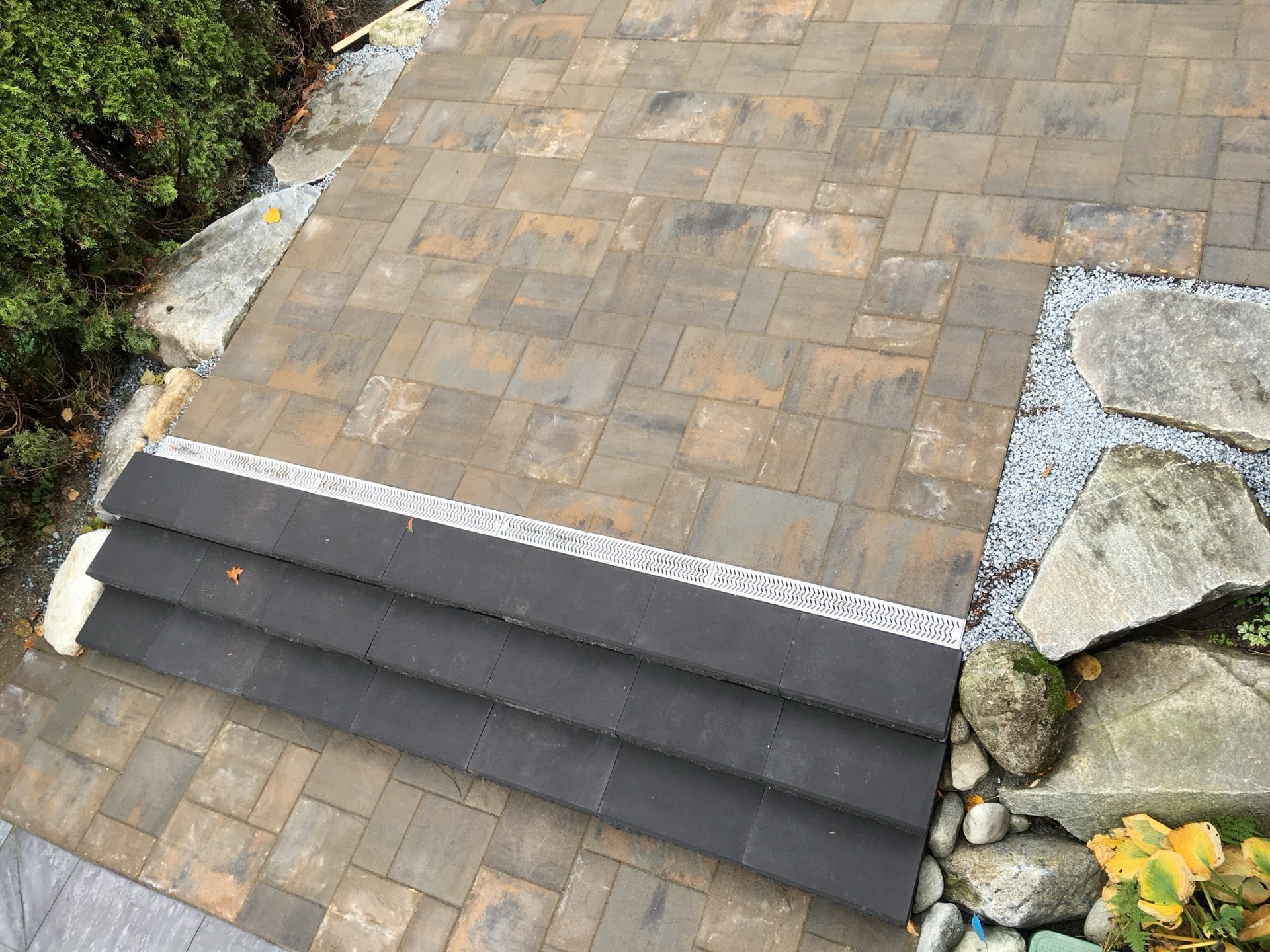 Stairs are one of our specialities. All stairs built by Nicholson Landscaping are properly sloped to allow water drain off, preventing water from remaining on the stair and reducing the risk of ice building up on them in the winter. Stairs built by us are safe! The material we use is up to you. Building a staircase into a retaining wall is always a pleasing look and allows easy, safe access to the other areas of your garden. We build all stairs to the proper step height and, if you like, with railings for your added safety.