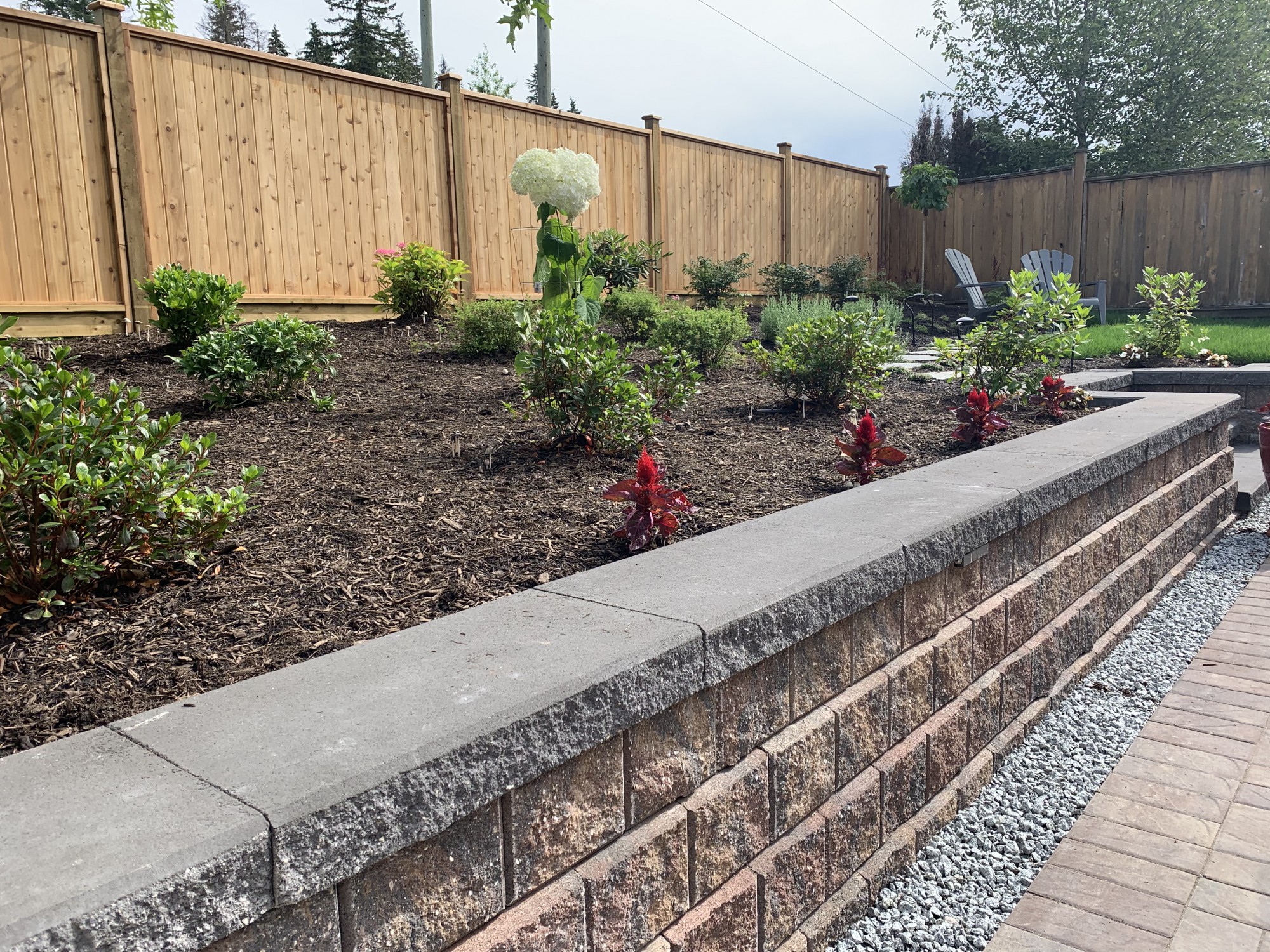 This lovely couple came to us needing some help make their back yard more functional, less maintenance and easier to entertain guests. We started by taking apart the deck and extended it by 15 feet to set the height of the beautifully coloured retaining wall and paving stones. Specifically designed is a small little flagstone walkway and patio up the steps in the garden to catch the evening sun. On top of the wall also sits a low maintenance garden area with some specifically chosen plants for them to enjoy all year round. Not pictured here is also the side access has been extensively cleaned up and filled with crush rock for a clean area to enter the yard from the side.