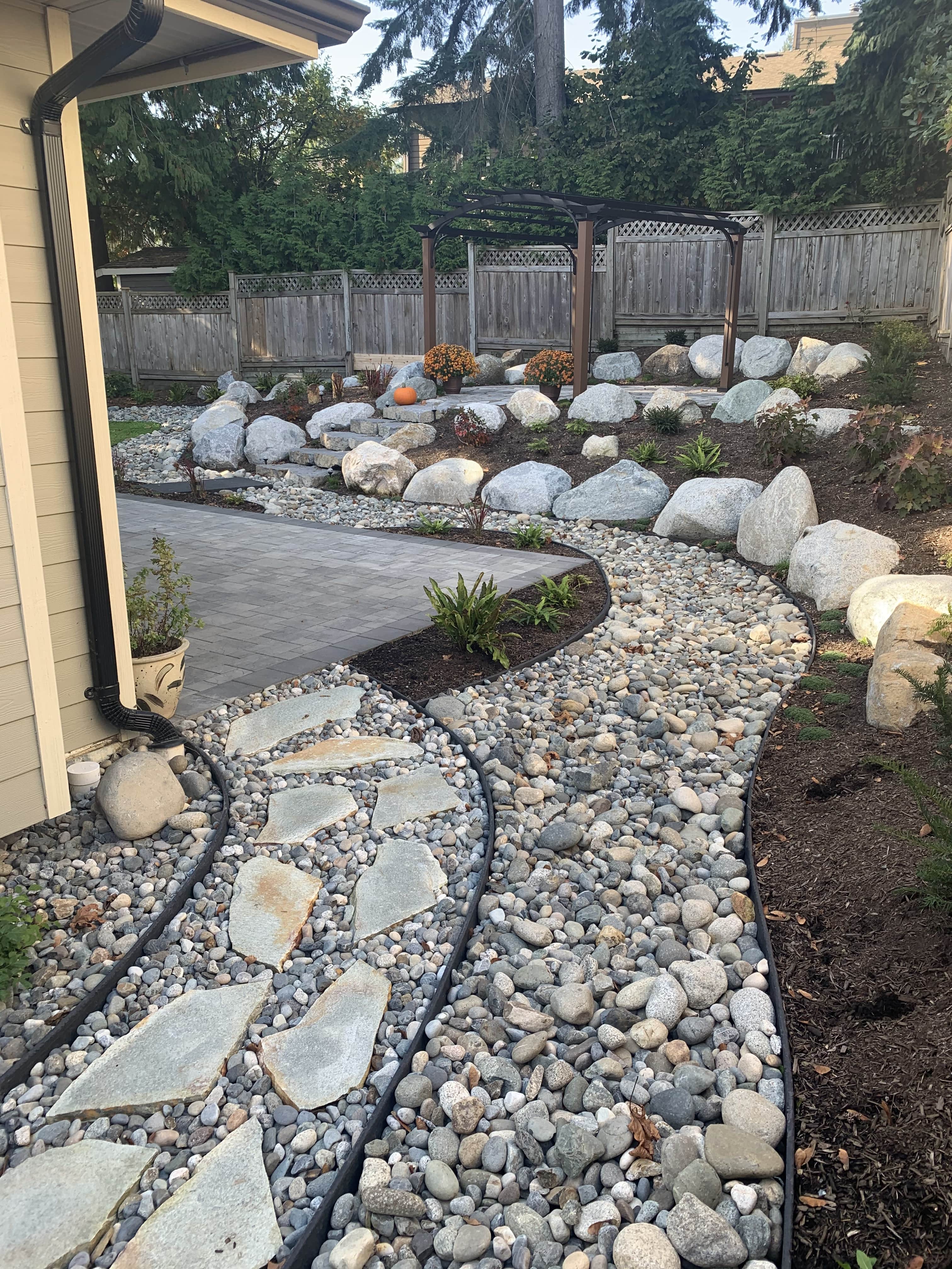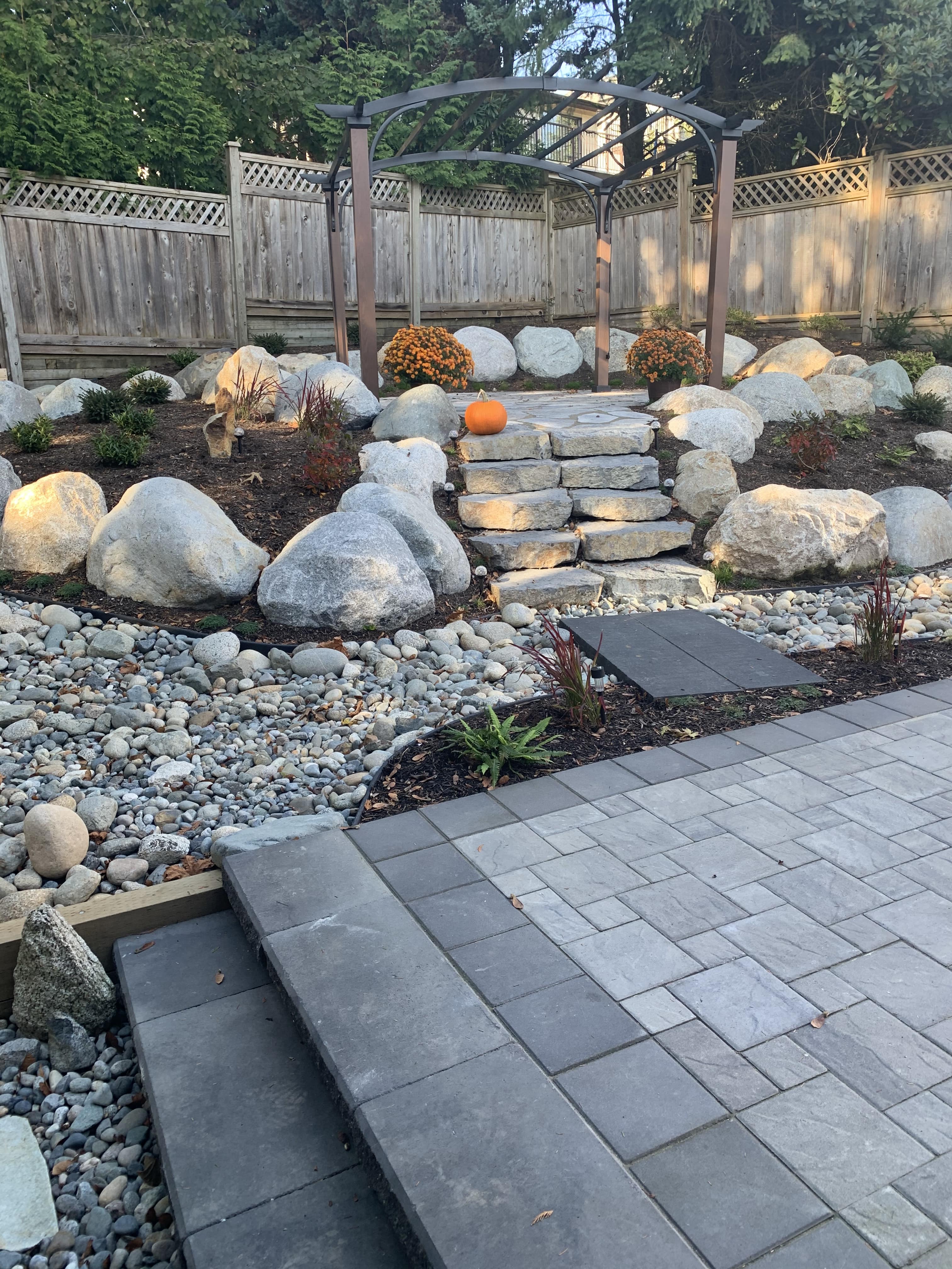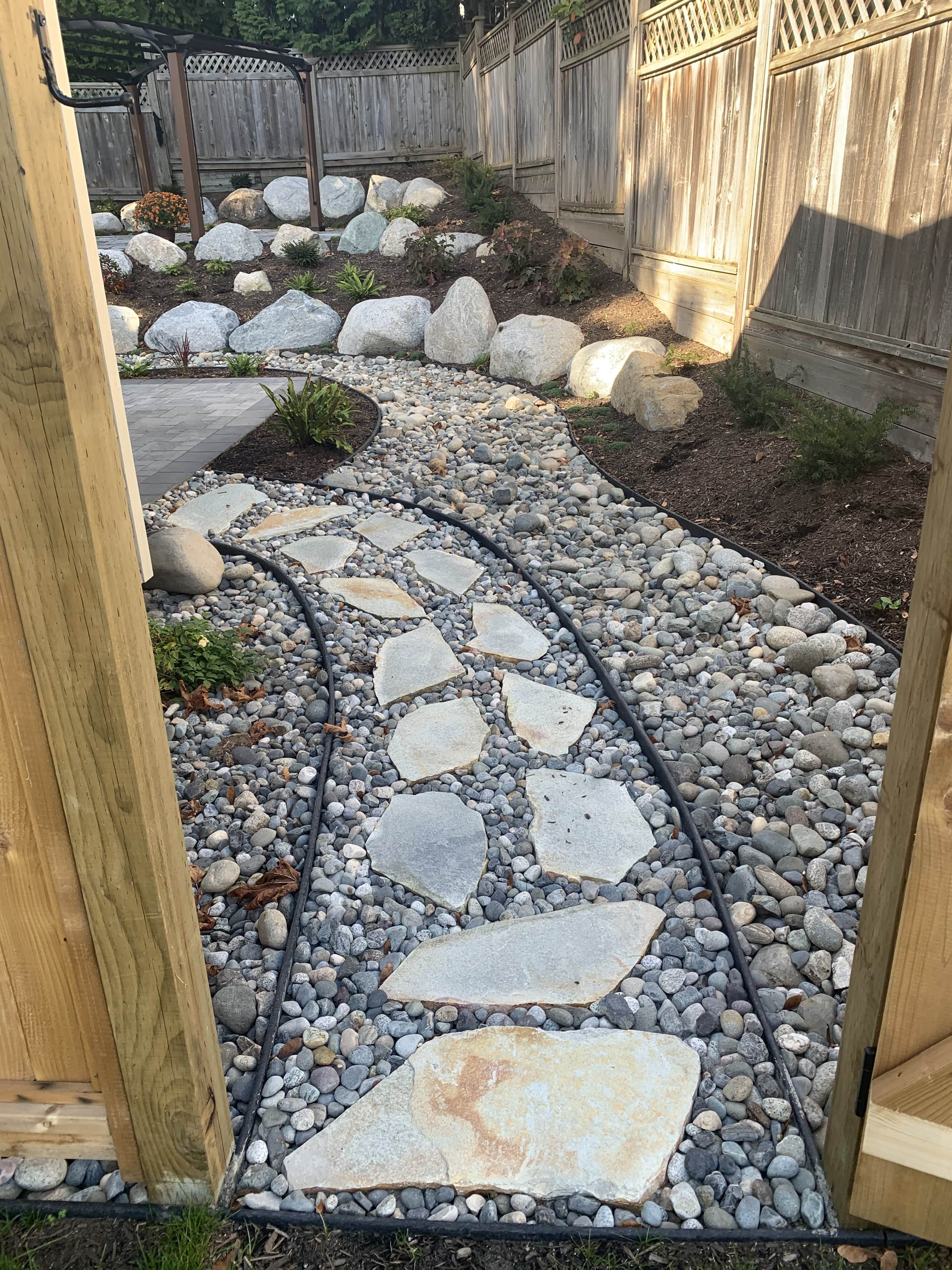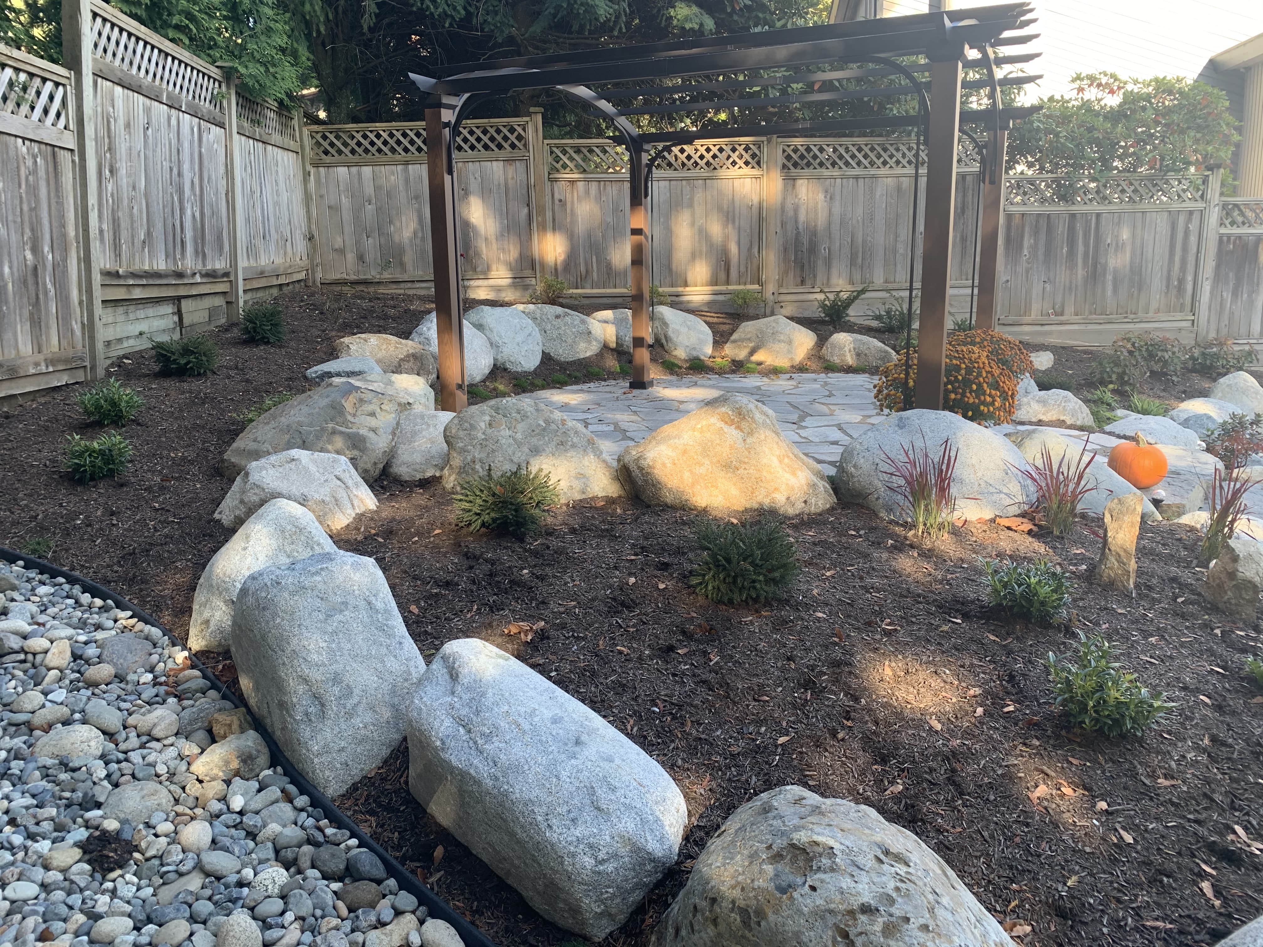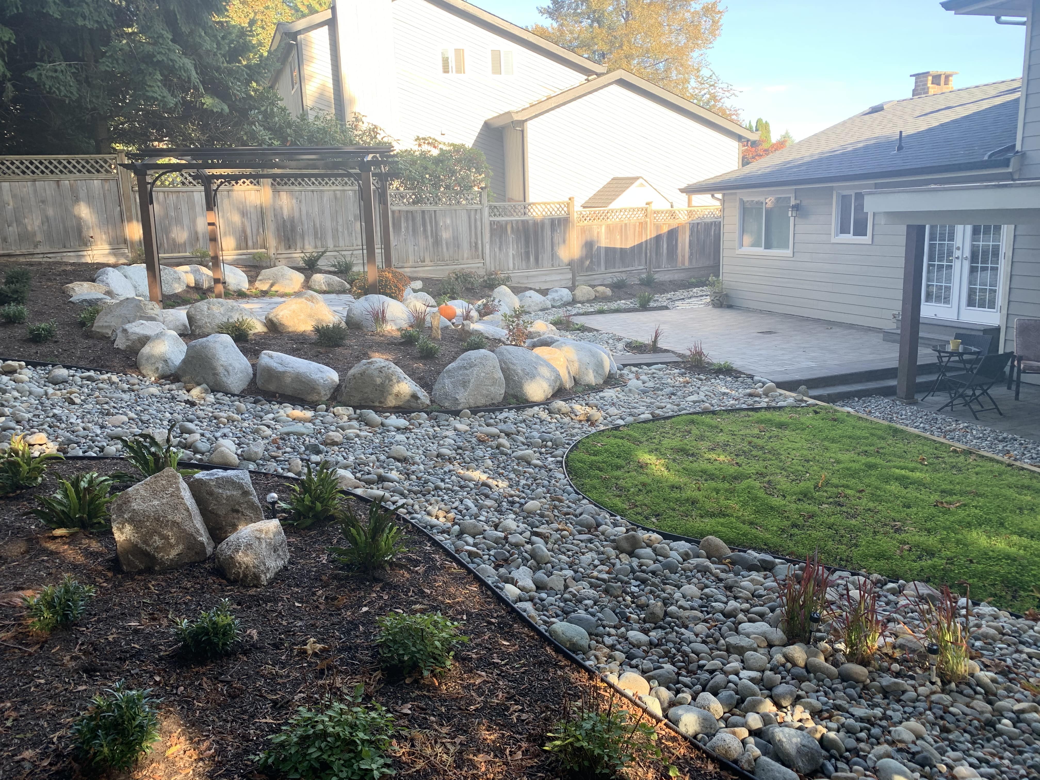 Our largest project ever! Almost every component of landscaping was installed around this small one story home on the hillside in south Coquitlam.