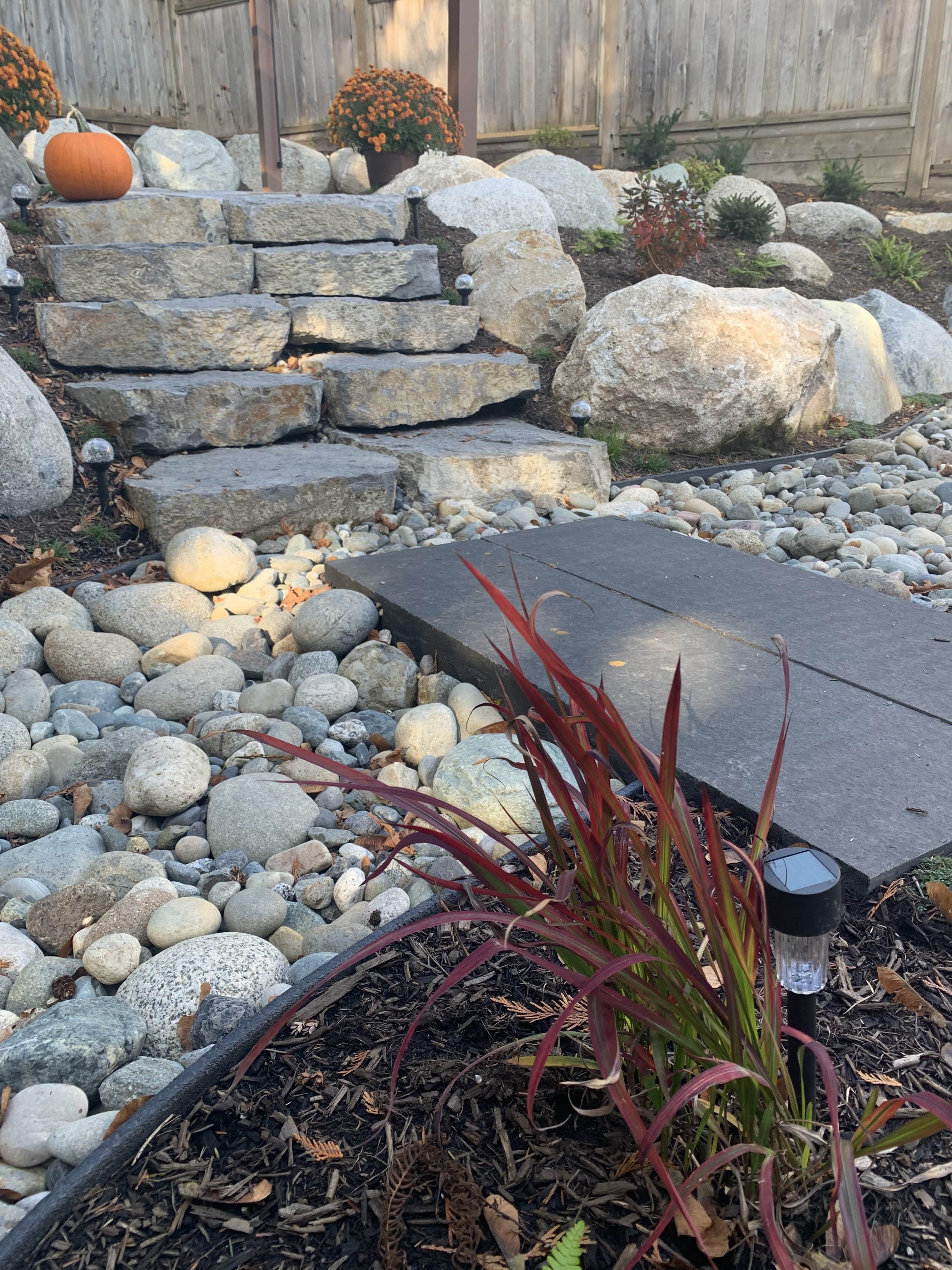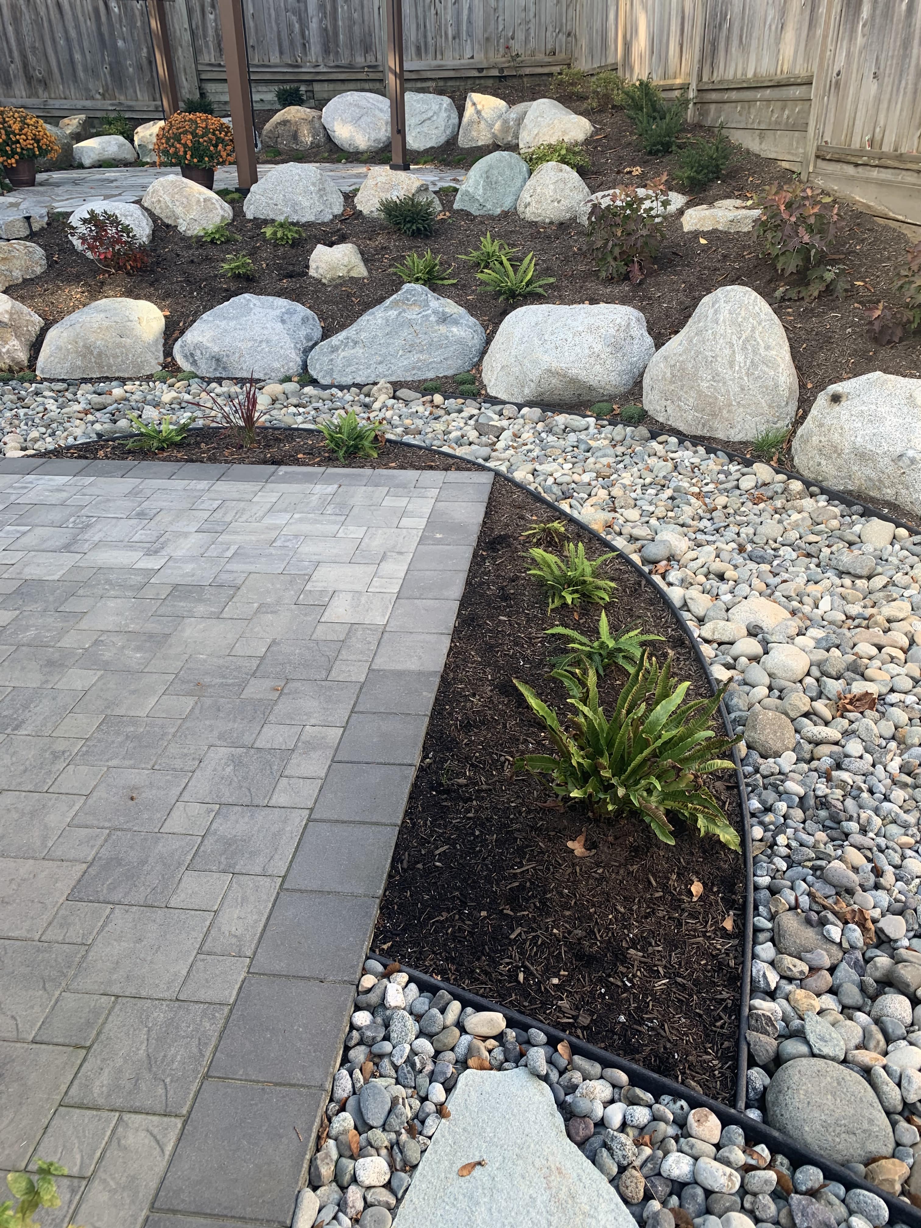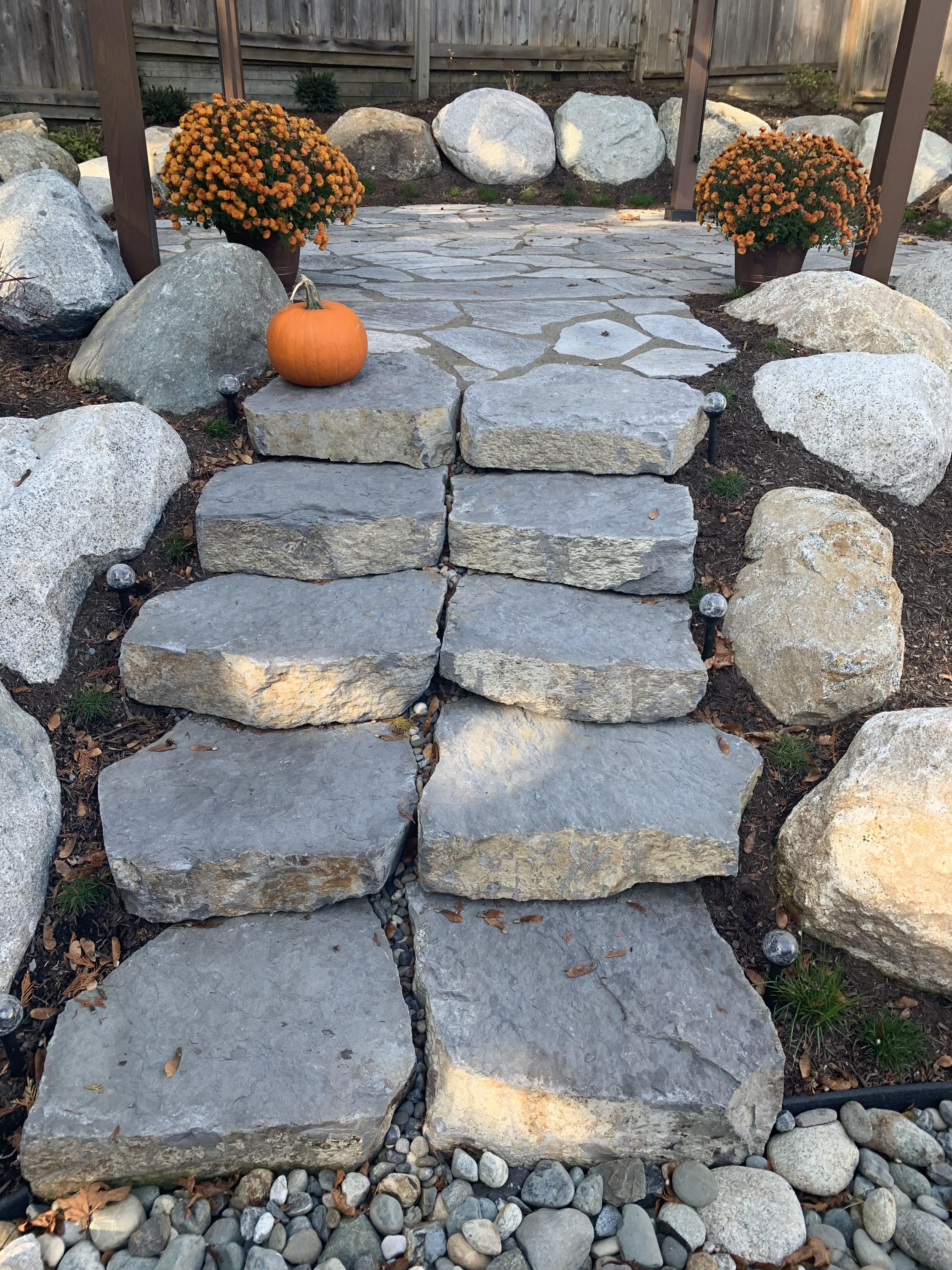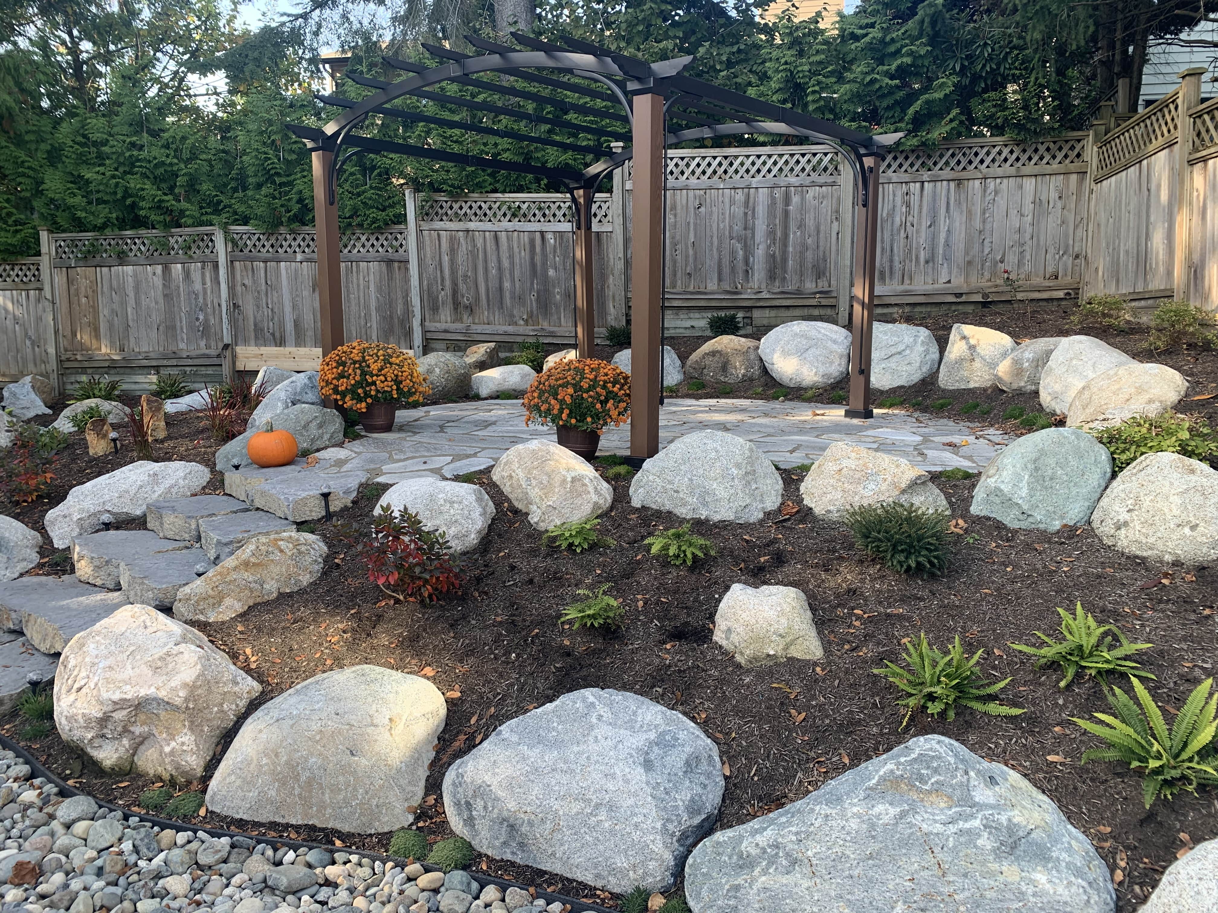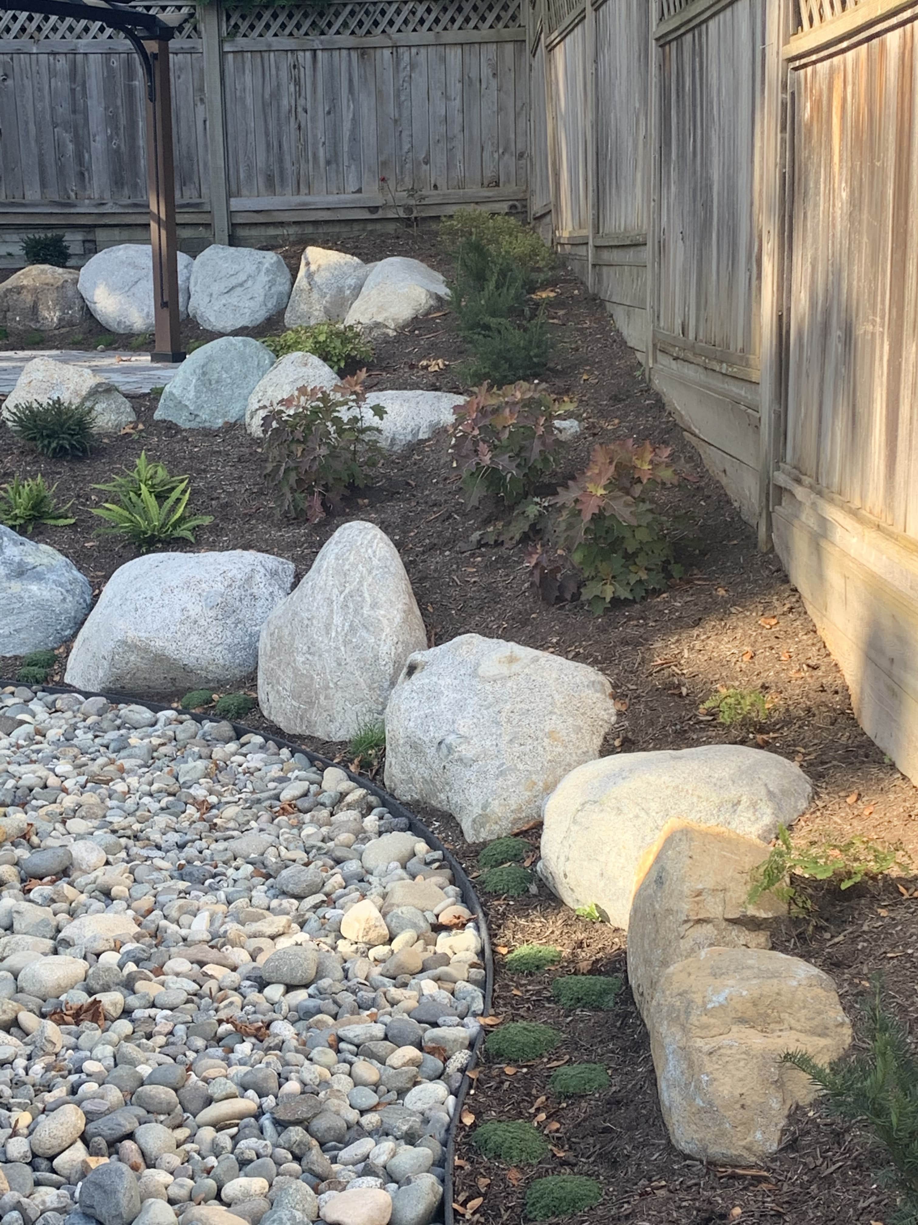 All natural stone project using boulders and flagstone. This client also had us back 2 years later to add a similar style to his front yard too. Thanks Ben!